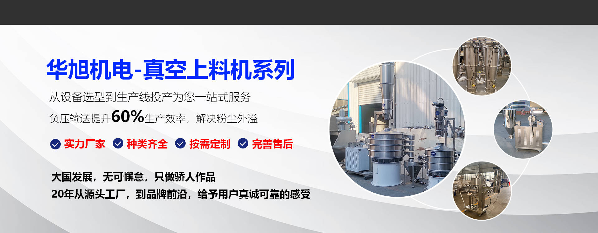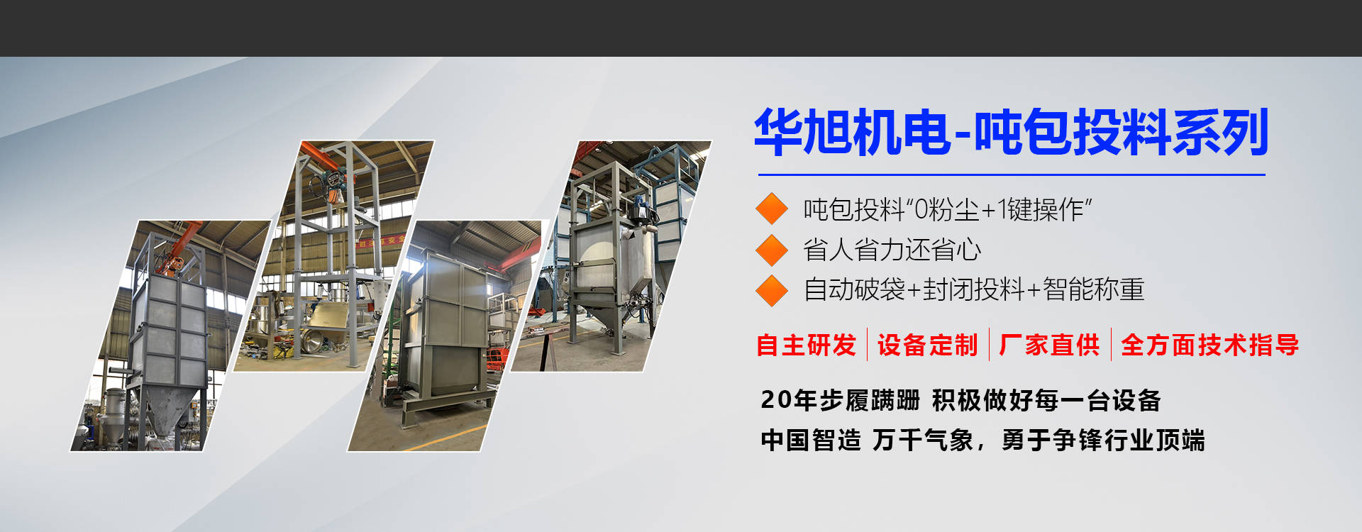 新乡市华旭机电设备有限公司,位于振动之乡、输送设备聚集地——新乡,公司主要生产真空上料机、无尘投料站、吨袋拆包机、螺旋输送机、混合机、包装机、三次元旋振筛、超声波振动筛、摇摆筛、直排筛、过滤筛等粉体处理设备。
