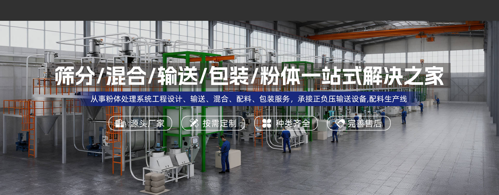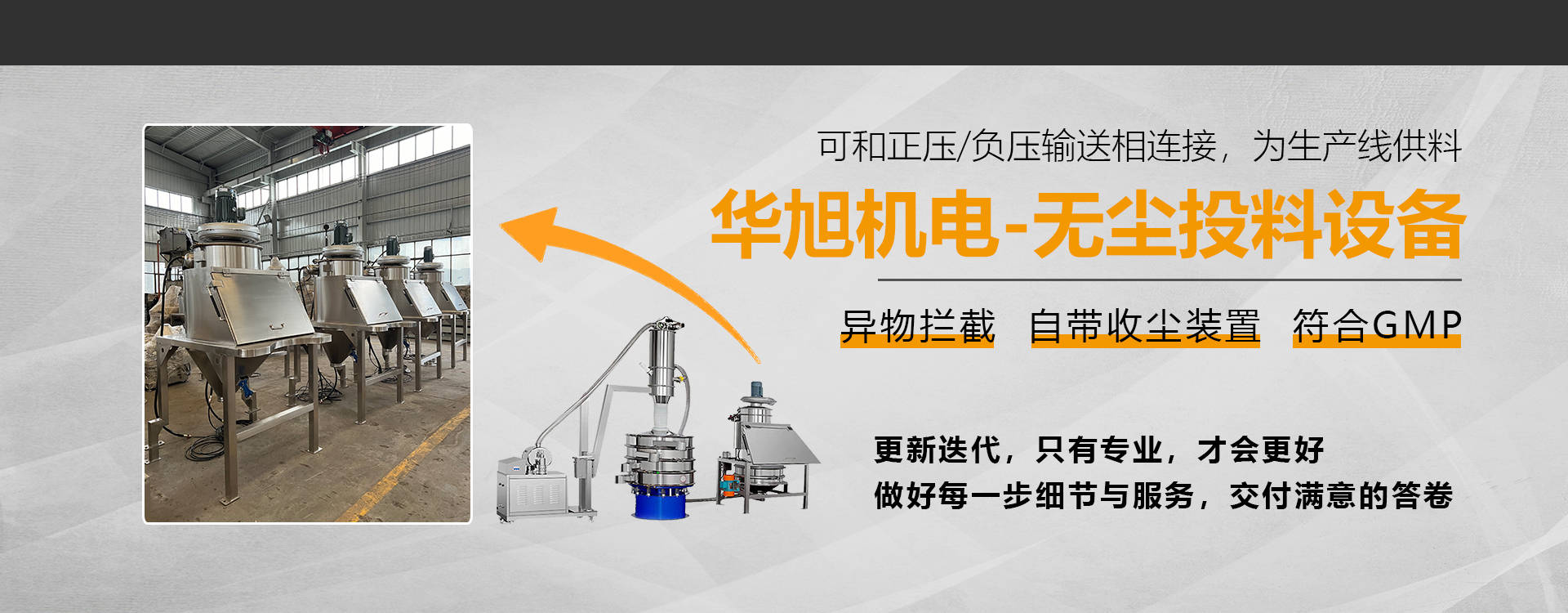 公司主营:真空上料机、无尘投料站、吨袋拆包机、螺旋输送机、混合机、包装机、坩埚填充机、三次元旋振筛、超声波振动筛、摇摆筛、直排筛、过滤筛等粉体处理设备;